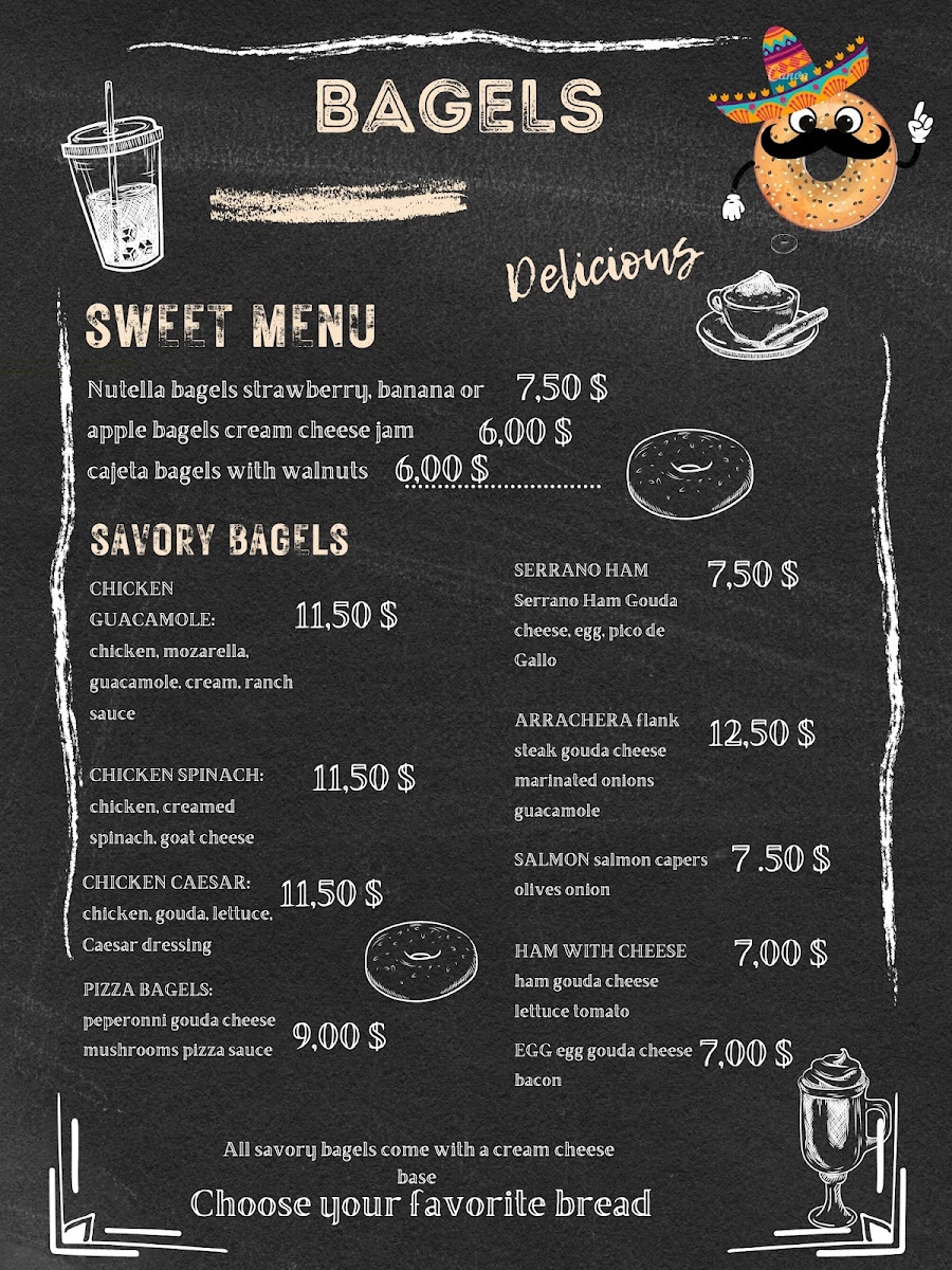The savory options are equally enticing. Picture sinking your teeth into the Chicken Guacamole Bagel for CA$11.50, where tender chicken meets creamy guacamole in perfect harmony. For bagel lovers who crave a classic hit, the Pizza Bagels or Serrano Ham for CA$7.50 provide that comforting familiarity, while the Arrachera, priced at CA$12.50, delivers a robust and hearty taste that’s hard to resist.